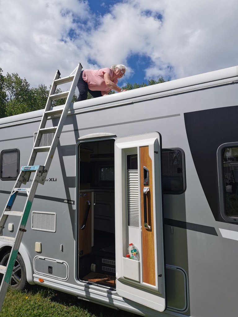 A couple of weeks later we hoped that the Government might end Auckland’s Lockdown. With that in mind we headed out to the motorhome for a bit of a spring clean. After months of going nowhere the green mould of winter was showing its face all over the roof. Sarah got on-top of things with some Wet and Forget leaving nature to do it’s thing. While I washed down the worst effected areas of the body. We don’t have running water where the motorhome is stored so it was a case of buckets and the water that remained in our tanks.