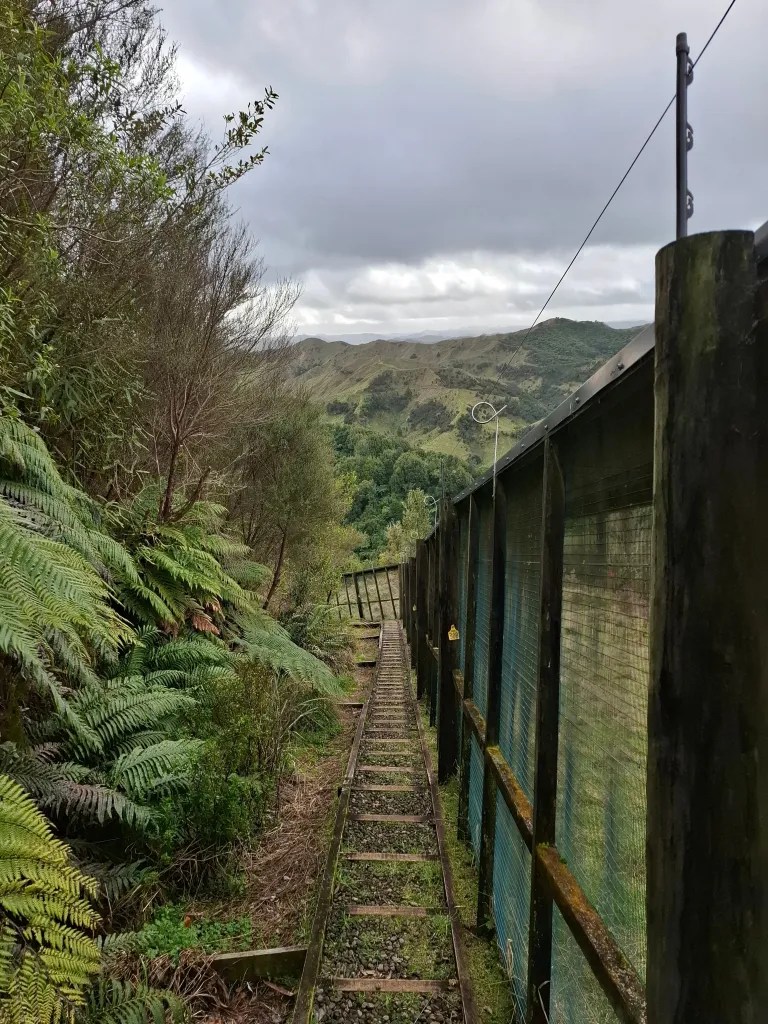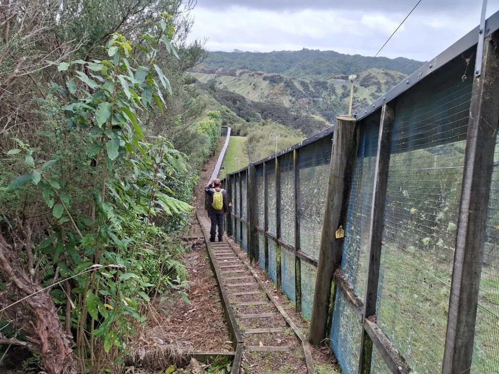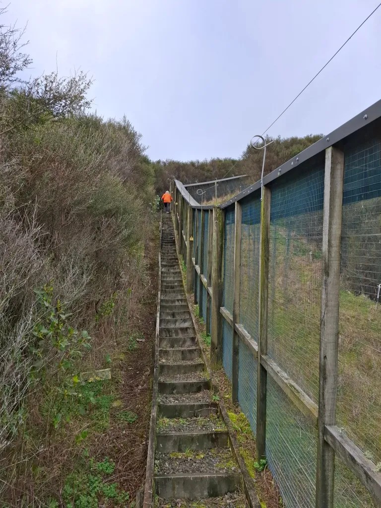 The next morning I asked Sarah if she felt she could tackle the other walk, which follows the ridge around the lake and has a sign at the base of the track telling you that it’s a steep climb and a good level of fitness is required. She was up for the challenge and after a good breakfast we set off. I agree that it is steep but the hundreds of steps cut into the hillside at the start of the walk, make the going so much easier. I also found that you can use the nearby fence as a sort of handrail to help pull you up. After breaking her wrist when she slipped on a walk last year Sarah was taking no chances taking along and using her new walking poles. The track must be used to help maintain the fence on the inside and also make sure that no trees are overhanging allowing pests to enter.