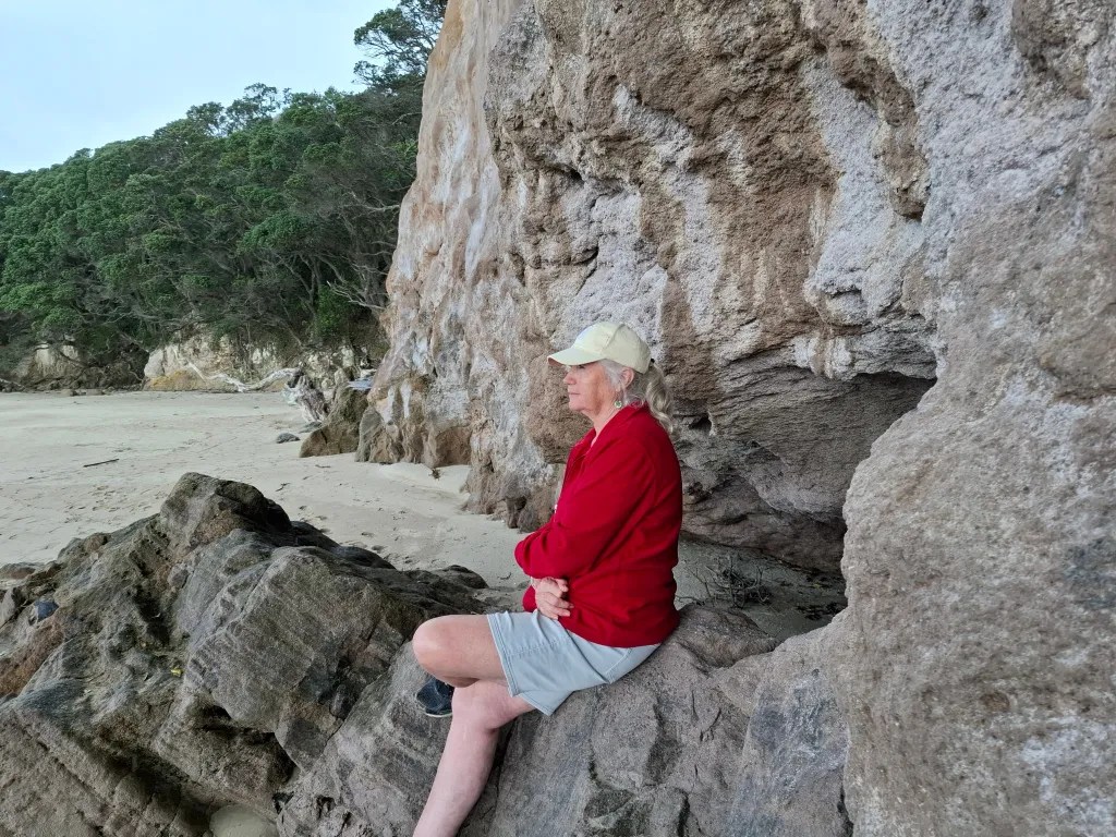 How surprising 😁, with the motorhome parked it was time to explore. We headed down the beach towards the Pa walk. The rain wasn’t quite done with us but we did manage to find shelter under the overhanging cliffs. While sheltering there we watched a few people scurrying down from the Pa site looking for cover from the rain. We did wonder for a short while if we should turn back and at least get our rain coats out of the camper, but in the end just continued on.