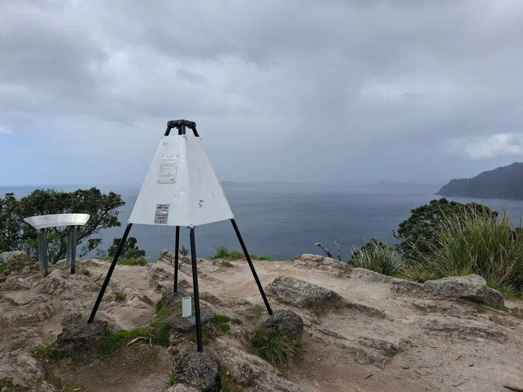 Sarah was keen to get the bikes out and see if we could ride up to the sumit of the hill that looks back over Pauanui. It turns out that you can’t ride all the way to the top but you can get a decent way. Leaving our bikes padlocked together we then followed the track up towards the trig. This climb was a lot easier that the one in Pauanui and other than the having to clamber over rocks for the last twenty metres a fairly easy walk. The view from the top was worth the climb but as you can probably see in the photo we could also see the rain coming. Thankfully nothing more than a light shower fell while we were at the top but it did look like it would get heavier.